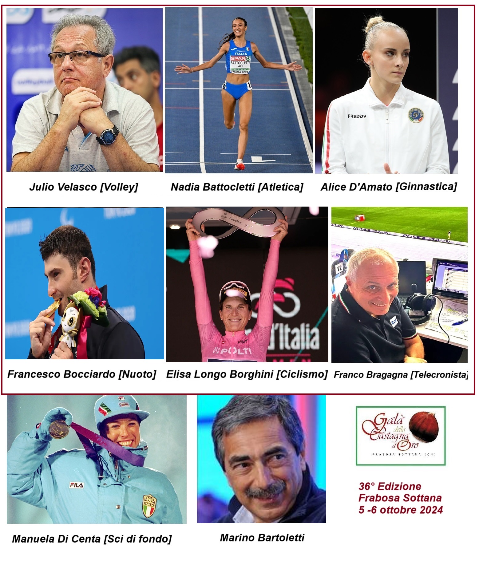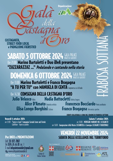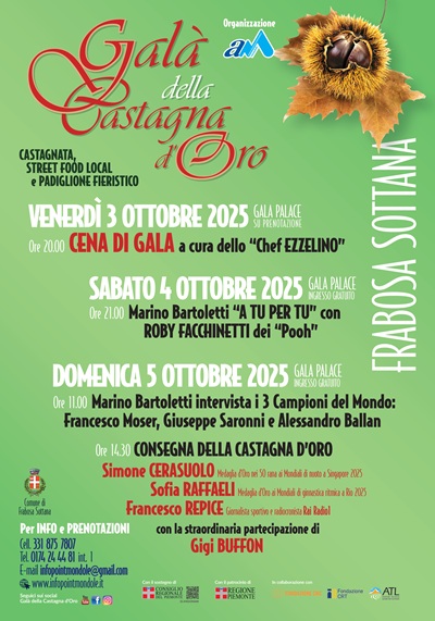 FRABOSA SOTTANA (CN) – Nei giorni scorsi sono già stati resi noti i nomi degli ospiti del Galà della Castagna d'Oro 2025. La 37a edizione dell’evento in programma da venerdì 3 a domenica 5 ottobre si preannuncia da record, con i fari puntati sui grandi atleti dello sport italiano ed internazionale.