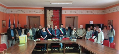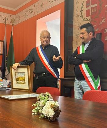 Frabosa Sottana - sabato 4 ottobre si sono svolti nella Sala Consiliare del Comune i saluti istituzionali alla delegazione del comune gemellato di Collobrières e consegna del quadro "Primavera" del pittore Giorgio Roggero (architettura alpina - tetti racchiusi - con sfondo delle nostre montagne) all'assessore francese Serge Sauvayre.