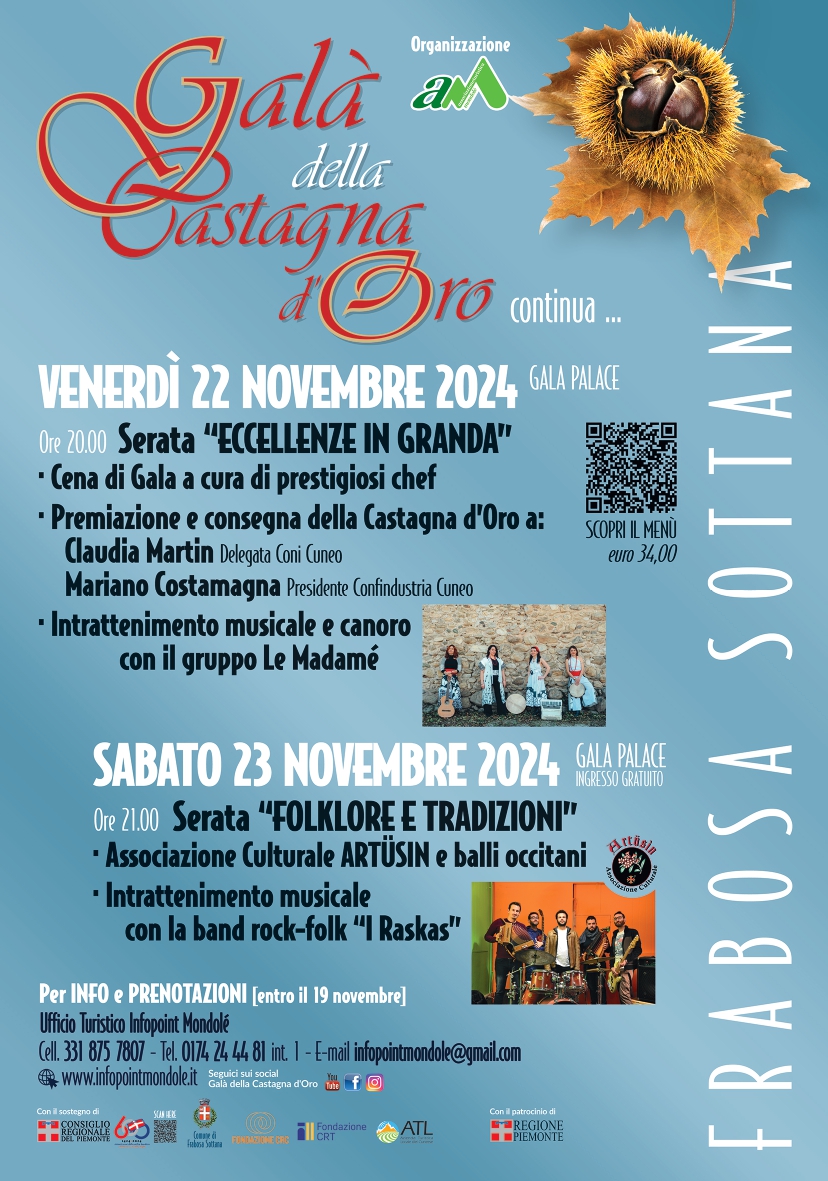 La rinomata kermesse autunnale si inaugura venerdì 3 ottobre con la raffinata Cena di Gala: a partire dalle ore 20, il Gala Palace sarà lo scrigno delle Eccellenze della Granda: sia sulla tavola, con un menù gourmet sapientemente preparato e curato dell’impareggiabile chef “Ezzelino”, affiancato dal Resident Chef Andrea Bertolino, a base di prodotti di qualità, sia Eccellenze sul palco, con la consegna del premio Castagna d’Oro al Dott. Luca Crosetto, Presidente Camera Commercio di Cuneo e di Confartigianato Cuneo e alla Dott.ssa Giuliana Cirio, Direttore Generale Confindustria Cuneo e Presidente Fondazione Industriali. Il loro straordinario impegno e la loro autorevole personalità sono stati determinanti per il progresso della Granda, contribuendo in modo significativo alla crescita economica e al rafforzamento delle comunità locali.