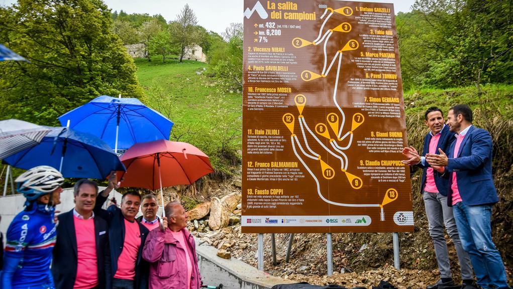 Sono 6 chilometri e 200 metri con pendenza del 7 per cento. E’ la cosiddetta “Salita dei campioni” che giovedì 24 maggio concluderà la diciottesima tappa del Giro ciclistico d’Italia da Abbiategrasso a Prato Nevoso. Sabato 12 maggio il Comitato tappa cuneese ha inaugurato l’intitolazione dei 13 tornanti ad altrettanti grandi campioni del ciclismo, italiani e stranieri. Sono, nell’ordine, Stefano Garzelli (al quale è stato intitolato il tornante numero 1), Vincenzo Nibali (il numero 2), Fabio Aru (numero 3), Paolo Savoldelli (numero 4), Marco Pantani (numero 5), Pavel Tonkov (numero 6), Simon Gerrans (numero 7), Gianni Bugno (numero 8), Claudio Chiappucci (numero 9), Francesco Moser (numero 10), Italo Zilioli (numero 11), Franco Balmamion (numero 12) e Fausto Coppi (numero 13).