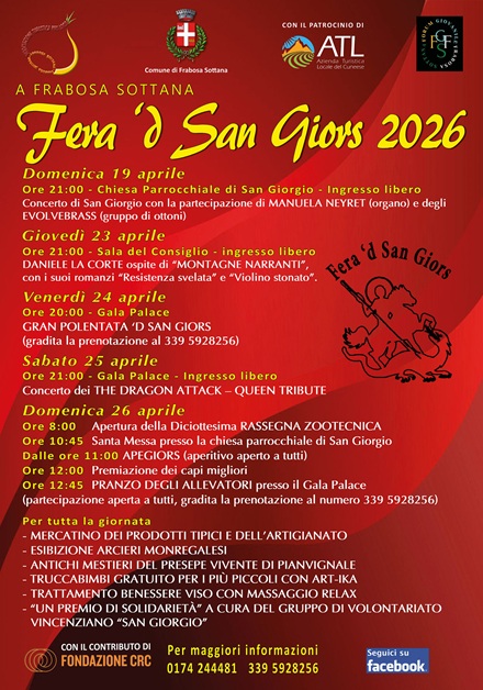 San Giors avrà come sempre il suo culmine nel weekend dal 24 al 26 aprile, ma la festa comincerà molto prima: il primo evento è previsto domenica 19 aprile, con un appuntamento musicale: si tratta del concerto di San Giorgio. Alle 21, nella Parrocchiale di Frabosa Sottana, si esibiranno l’organista Manuela Neyret e l’ensemble di ottoni Evolvebrass, per un concerto tra spiritualità e grande musica.